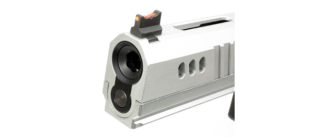 スタイリッシュなシルバー仕上げが目を引くモデル。スライドには3つのポートがあり、独特なスポーツガンらしい印象を与えます。スチール製ディスコネクターとステンレス製マガジンで、メンテナンス性と耐久性にも優れます。