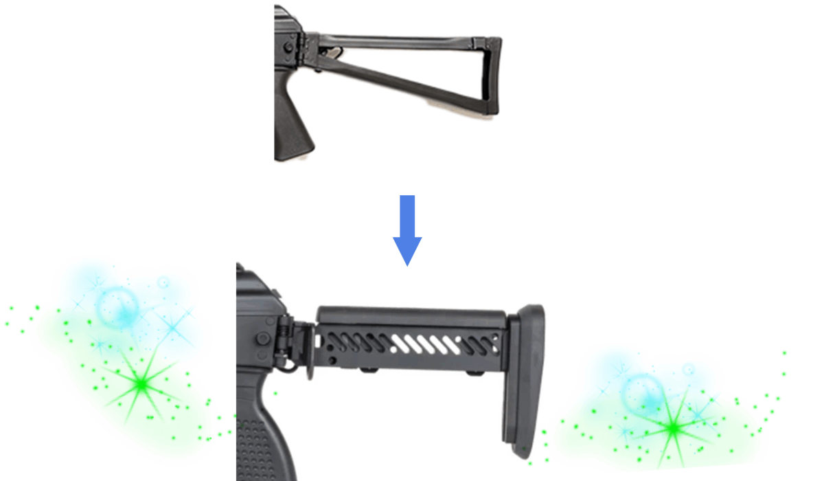 一部のコンバージョンキットでは、折りたたみ式の純正ストックから、ピカティニーレール対応のアダプターへ換装できます。これにより、より調整しやすいクレーンストックやPDWストックへの変更も可能に。