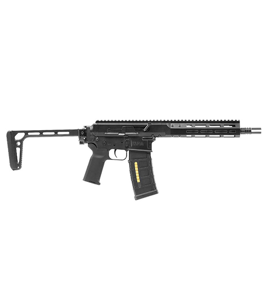ストックを畳んだままでも射撃可。CQB~車載運用で威力を発揮する。 - M-LOKハンドガード×前後フルレングスレールライト、フォアグリップ、レーザー、オフセットRDSなど拡張が自在。上面はモノリシック感覚で光学機器の前後セッティングに余裕がある。