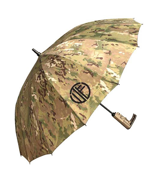 マルチカムパターンをプリントした雨傘です。グリップ部分にはストックを模した形状のパーツを配しています。