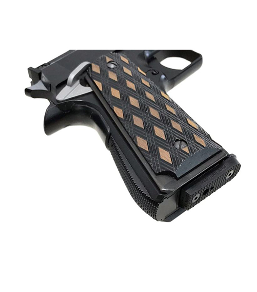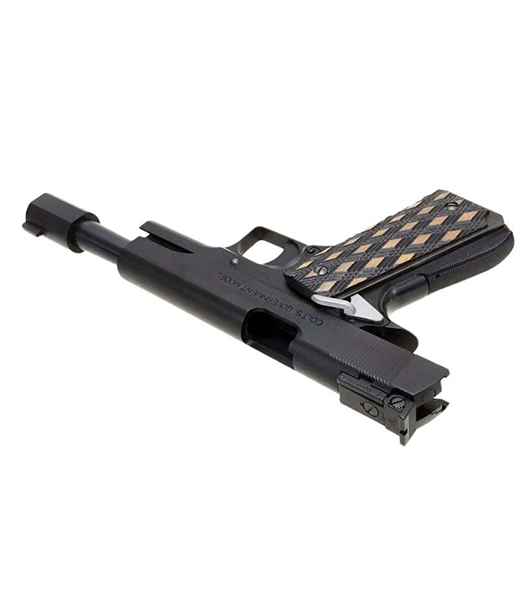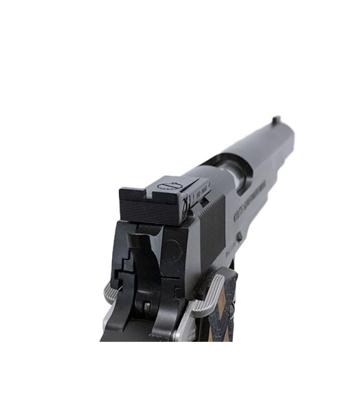 グリップにはスチール製のウェイト、バレル先端にはコンペンセイターではなくウェイトが装備されていたり、ノンホールのロングトリガーやグリップセイフティのオミットなどレースガンとしてのポテンシャルを高められている一丁に仕上がっています。