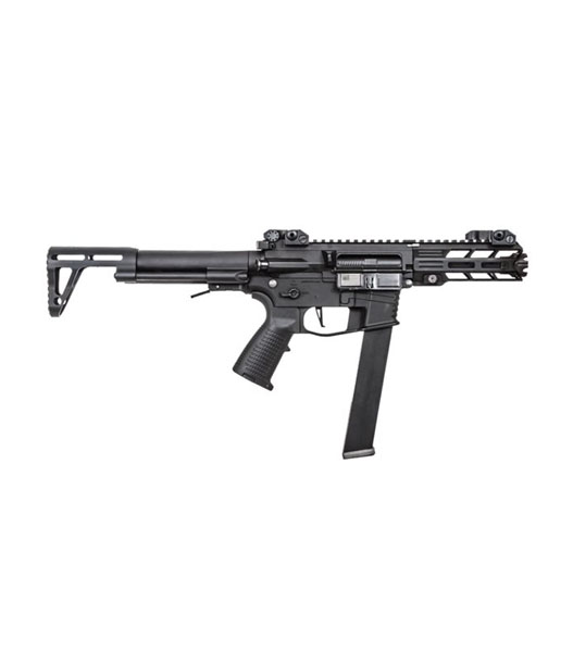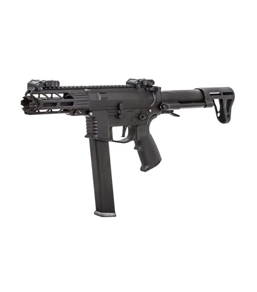 【詳細】CNC削り出し加工されたアルミ製レシーバーに5インチのM-LOK対応ハンドガードを搭載し、 更にスライドストックを装備したコンパクトで取り回しの良いサブマシンガンです。 最大の特徴として内部機構には電子トリガーシステム(ECS)を搭載しており、セミオートポジションでトリガーを長押しし、もう一度トリガーを引いてモード設定することで、 発射モードを3点バースト、5点バースト等に変更することが可能となっています。マガジン装弾数:約120発全長:約 500mm