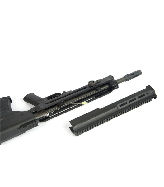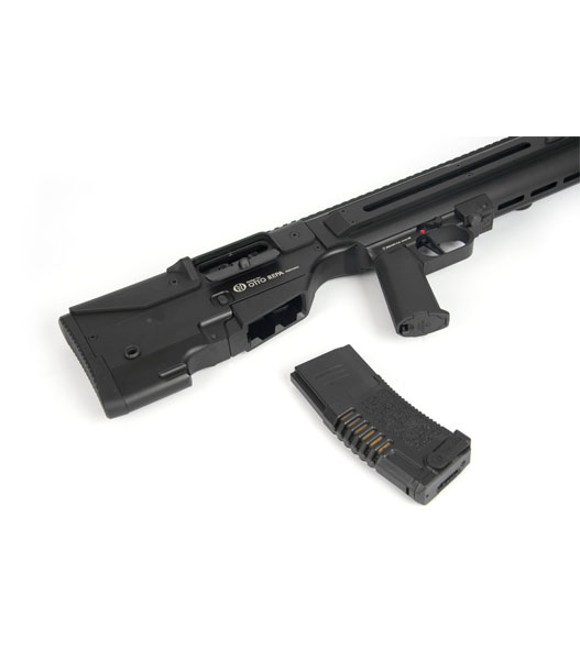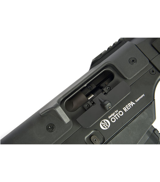 WA2000の開発にも携わったドイツのガンスミス、OTTO REPA(オットー・レパ)氏が設計したと言われるドイツのOMR社が開発のスナイパーライフル【SOC SLR】をベースにしたアサルトライフル【SOC AR】です。 機関部をグリップより後方に配置したブルパップ方式を採用していることが特徴。フレームはCNC整形された6063アルミニウム素材となっており、直線的かつ硬質なデザインが目を引きます。 本製品はギアボックス内にEFCS (Electric Firing Control System)という電子制御システムを搭載しキレのいい射撃が可能となっている他、デフォルトでセミオート、フルオート射撃の他に、2点バーストモードでの射撃も可能となっています。(別売りEFCSコントローラーによるモード変更は出来ません。)マガジン装弾数:約 300発