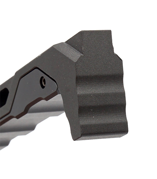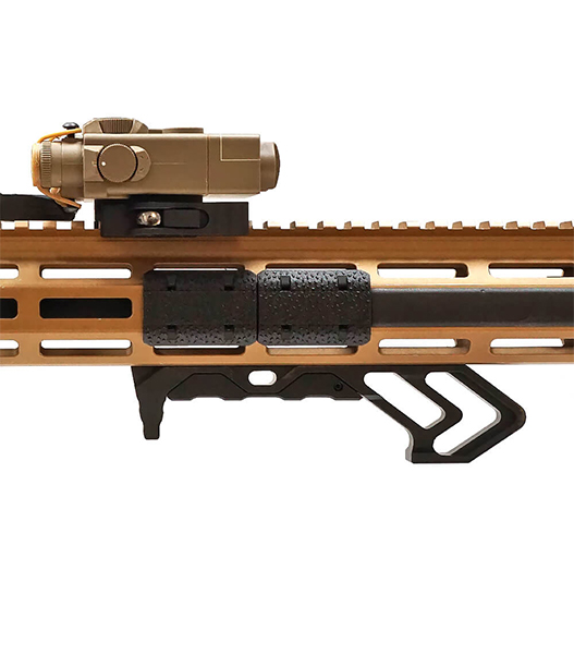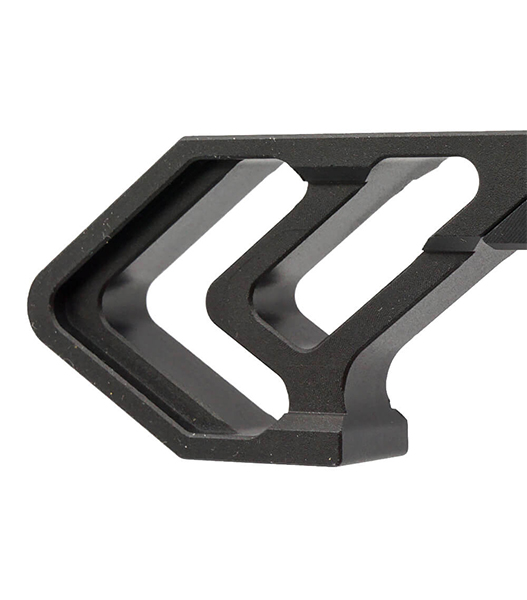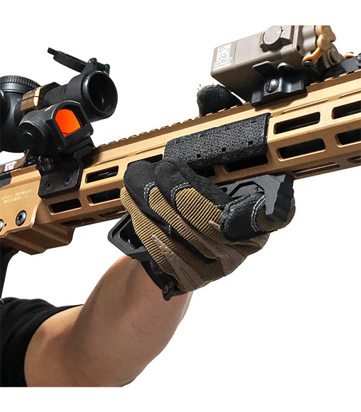 頑丈なフルメタル製ながら、肉抜きデザインのおかげで重量はわずか64gと軽く、ハンドガード先端へ取り付けても負担になりにくくなっています。