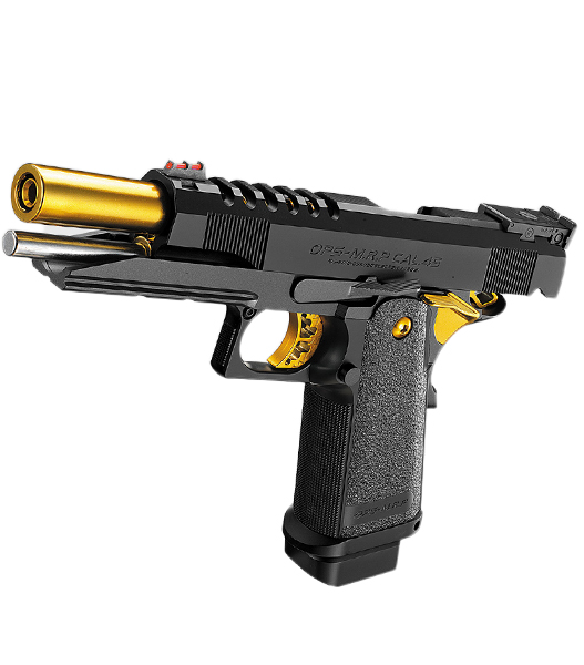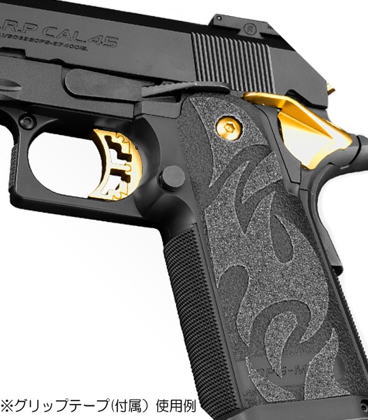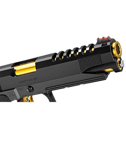 ゴールドのアクセント:アウターバレル、ハンマー、サムセフティ、トリガー、グリップスクリューは、格調高いゴールドに。ブラックボディとのコントラストが際立ちます。