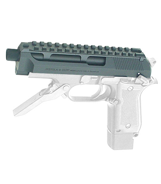 東京マルイ電動ハンドガンM93Rのスライドと交換し、上面にダットサイトやスコープが搭載可能な20mmのレイルを装備できるオプションスライドです。銃口部分には、サイレンサー用の14mm逆ネジが装備されています。