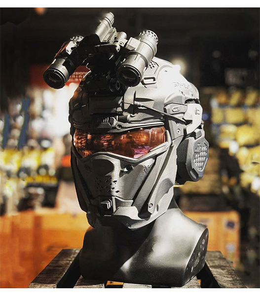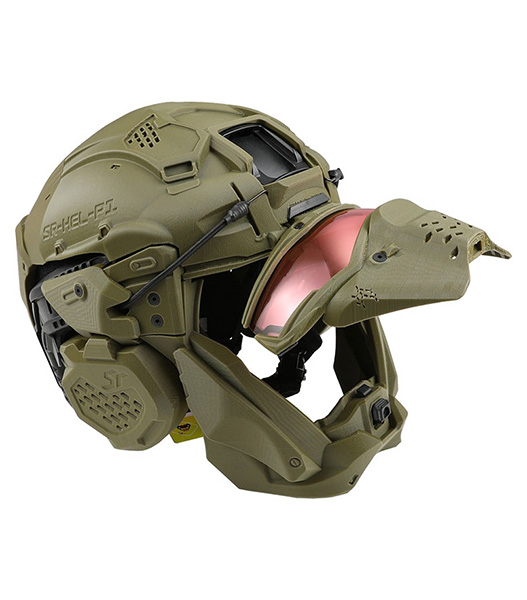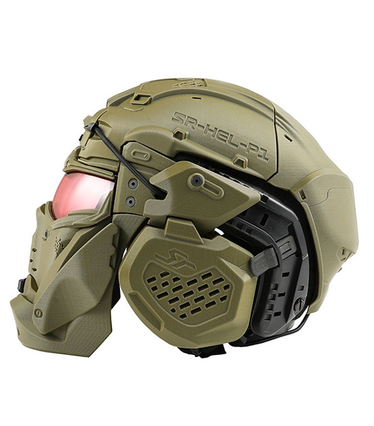 SRU※セール品のためクレジットのご利用はいただけません。ご了承ください。SRUタクティカルヘルメットは個性的な近未来的デザインと高い機能性を持つフルフェイスタイプヘルメットです。 3Dプリンティング技術を駆使して設計された構成パーツと、保護性能・通気性に優れたマスクの融合により、斬新で実用性の高いヘルメットとなっています。レンズは顎部分に配置されたボタンにより跳ね上げられるフリップアップタイプ。 状況に応じてレンズ越しの視認に加えて、ダイレクトな視認もワンタッチで行うことができます。