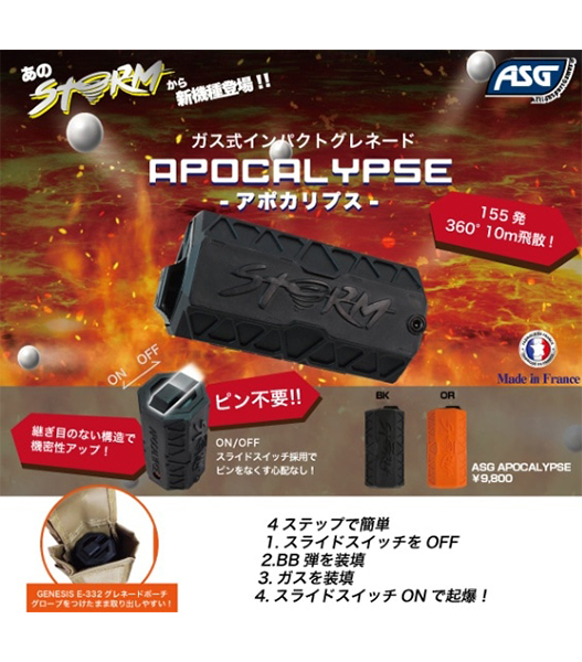 軽量で操作性に優れたNEWガスグレネードです。ピンを抜くことなく、スライド式のスイッチひとつで起爆が可能です。