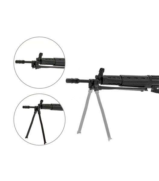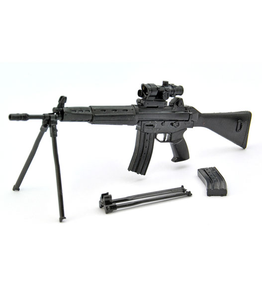 1989年に日本国自衛隊に採用された5.56mm口径の自動小銃。防衛戦闘に主眼を置いた自衛隊らしく、2脚は標準装備(着脱式)で、NATO標準のSTANAGマガジンが共有可能。銃口部には、発砲炎を減らすフラッシュサプレッサーと反動を抑えるマズルブレーキの機能を併せ持つ特徴的な消炎制退器を備えています。