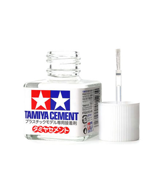タミヤプラスチックモデル作りの必需品、接着剤。使用中の安定を重視して決められた四角いビンです。たて、横それぞれ約4cm、高さが約3.5cm。作業中にたおれる心配が少なく、また万一倒れても一度に多量の接着剤が流れ出てしまうことがありません。