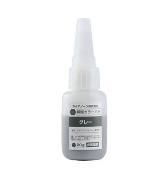 ガイアノーツ高粘度の色付き瞬間接着剤系パテです。使用用途の多いサーフェイサーグレーの色に最初から近づけた色になります。このグレーをベースにして他のカラーパテを混色することが可能です。遅硬化タイプなのでじっくり調色してから使用できます。硬化後は切削性が良く、デザインナイフや紙やすりで仕上げることができます。合わせ目消しや気泡の穴埋めに最適です。硬化までに時間がかかるので、早く作業したい場合は硬化促進剤(スプレーなど)をご使用ください。容器をリニューアルしたことで使い勝手、保存性が向上しています。内容量:20g