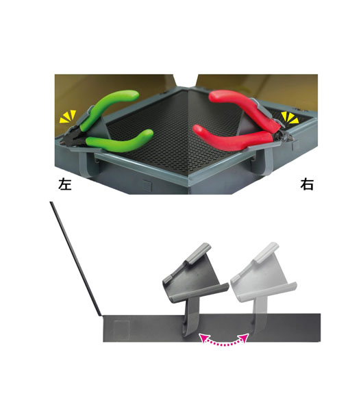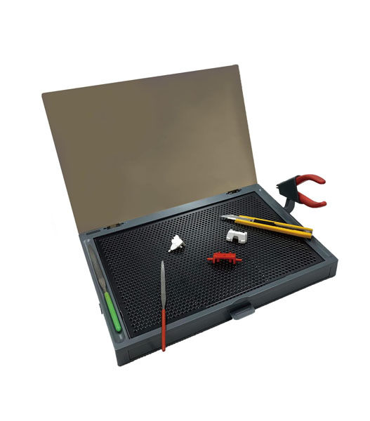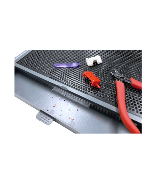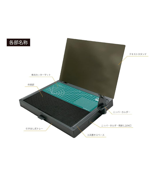 エトワール作業部に穴が無数に空いた金属製のプレートを配し、ゲートカットやヤスリがけ等をプレートの上で行えば、切りクズや削りカスで自身の作業場を汚さず、作業に集中することが出来るコンパクトな作業台です。サイズ(収納時):約297mm×209mm ×30mm