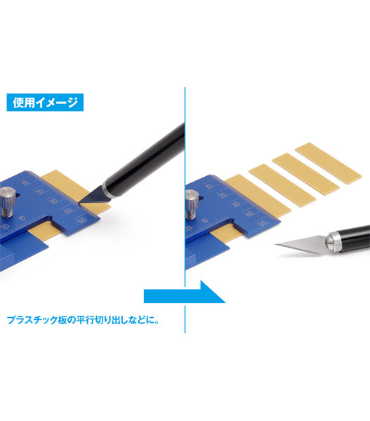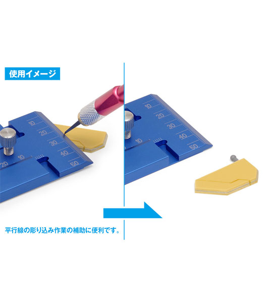 プラスチック板の平行切り出しや、模型部品への平行線の彫り込み作業などの補助に便利です。