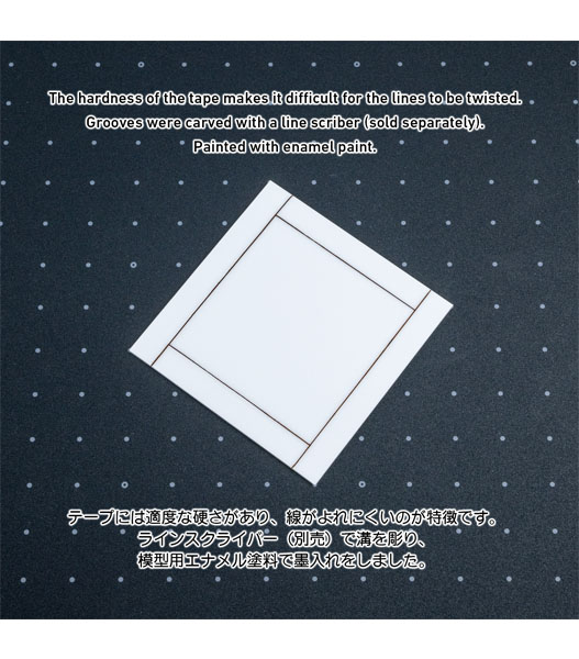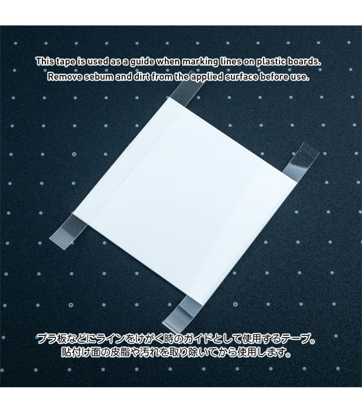 スジボリ用工具やケガキ針などでスジボリ工作をするときに使用する透明ガイドテープ。狭い箇所には使えませんが、3mm幅タイプと比べて接着面積が増えているので粘着力アップ。しっかりと貼り付けることが可能です。狭い場所には3mmを、広い箇所には粘着力の高い6mmを使い分けてください。透明なので下面を確認しながら、まっすぐな線をブレずに彫ることができます。直線はもちろん、角や曲面にもよくなじみ、ガイドなしでは難しかった曲面のパネルラインも簡単に工作することができます。適度な粘着力があり数カ所の作業を連続して行えます(荒れた面では接着力が落ちます)