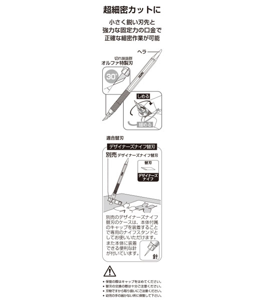 オルファ薄物切りや極小部品の切削に適したペンタイプナイフ。口金が刃をしっかり固定するのでガタつかず、細密な作業も快適に行えます。ヘラ状の本体後部はパテや粘土の成形等に便利。刃先角度30°。別売りの替刃(XB216)のケースに本体付属のキャップをセットすれば、専用スタンドとして使用可能です。替刃(XB216)にはプラスチックやアルミのケガキなどに便利な針が付属しています。※販売時本体に刃は装着しておりません。 ・付属品:替刃5枚付