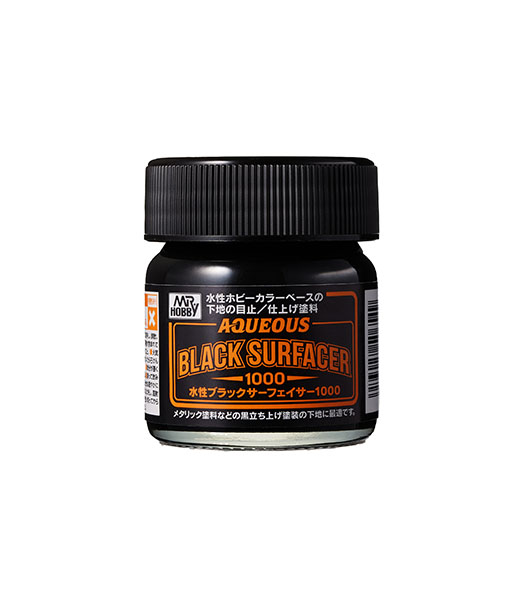 ブラックサーフェイサー1000は粒子は下地の仕上がり色を黒色にしますので、金属色の下地として、また黒立ち上げ塗装の下地として、ご利用いただけます。下地作成と黒色塗装を一度で終えることができますので、大変便利です。