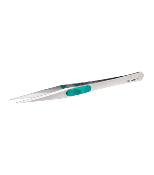 精密工作に適したストレートタイプのナイフエッジ型ピンセットです。先端はフラットタイプを採用長時間の工作作業時の指先への負担を軽減しました。指先の延長感覚の使用感です。