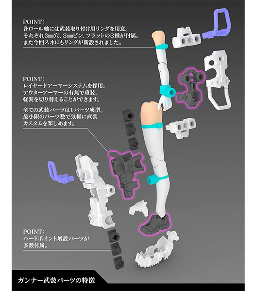 ・各部に配置された3mm径のジョイントや頭部の互換性により既存『M.S.G』『フレームアームズ』『フレームアームズ・ガール』『ヘキサギア』『創彩少女庭園』『アルカナディア』シリーズ等と各部併用が可能。