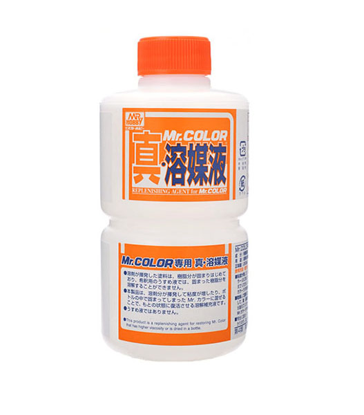 MR.カラー専用です。水性ホビーカラー、Mr.メタルカラー、他社塗料には使用できません。うすめ液としては使用できません。溶媒液を入れすぎたカラーは、プラを溶かす場合があります。入れすぎに注意してください。