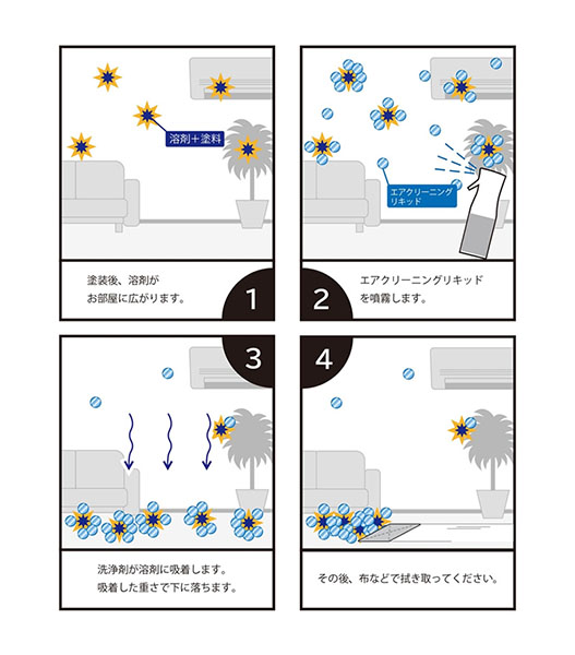 ガイアノーツ香料でにおいをマスキングして、さらに溶剤や塗料そのものを空間から除去する空間洗浄剤です。