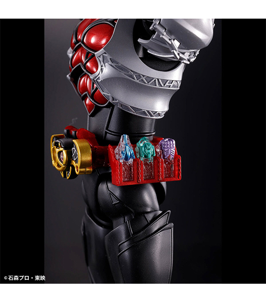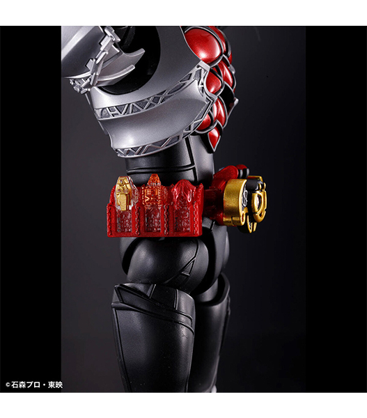 ■キバ特有のポージングを再現するため、腰、股関節の可動軸を再構築。股関節の内部パーツに連動して腰外装が可動することで、脚部の広範囲な可動を実現。