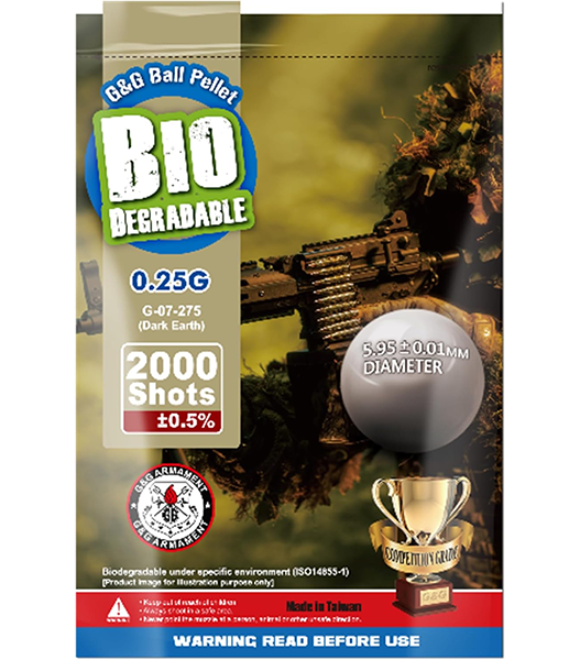 G&G製の精密バイオBB弾です。重量は0.25gで入り数は約2000発になります。