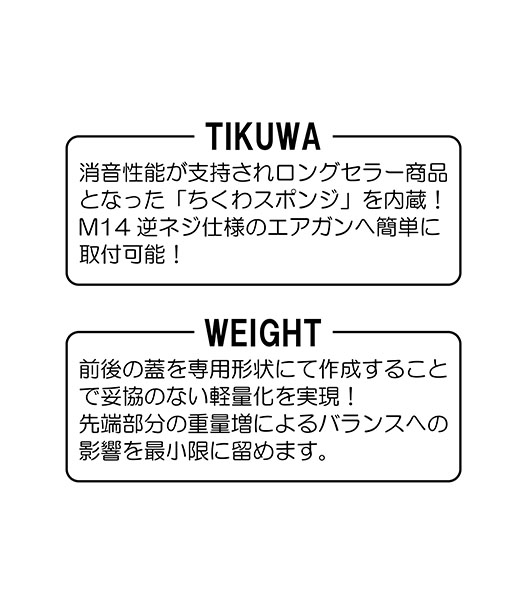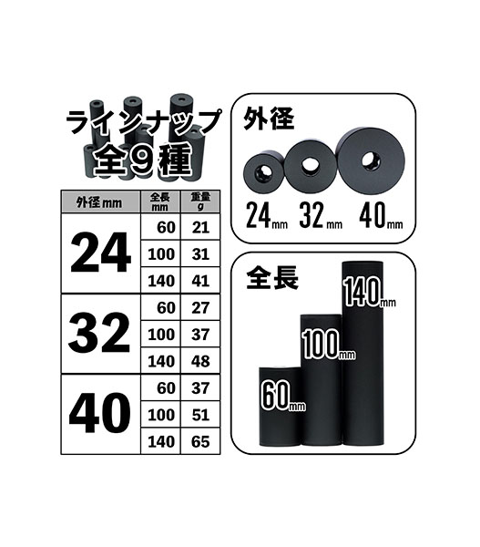 ・ちくわ軽量サイレンサーは消音性能を最大限高めるため一般的なサイレンサーより内径を小さく設計しています。(外径24:8.8mm、外径32、40:10.5mm)