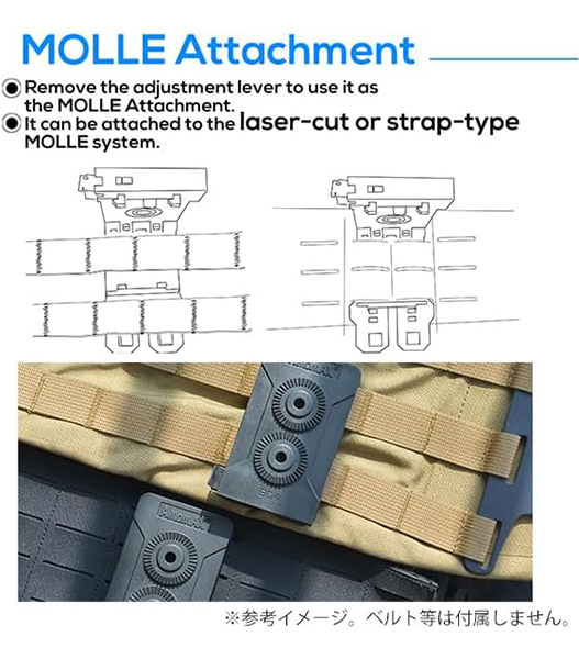 AMOMAX製 ポリマー ホルスターに対応するベースアタッチメントです。MOLLEシステムとベルトの両方に対応する一台二役のアタッチメントとして設計されており、