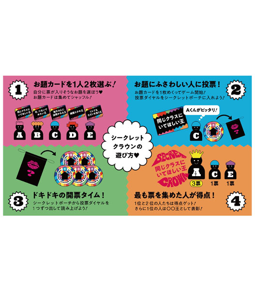 お題カードがなくなるまで1~2を繰り返して、もっとも得点の高い人が「シークレットクラウン」です!