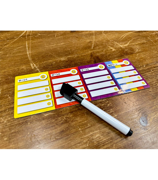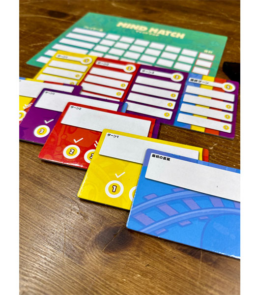 送信者は連想を4回行います。最初はお題カードの言葉から連想した言葉をタイルに書き、受信者はこれを予想します。予想する言葉は最大4つまで書くことができますが、予想した言葉が少ないほど当てたときのポイントが大きいので、時には勝負することも重要でしょう。全員が予想を終えたら、答え合わせをして獲得ポイントを確認します。このとき、送信者も正解した受信者の数に応じてポイントを獲得できます。