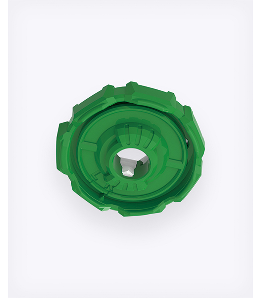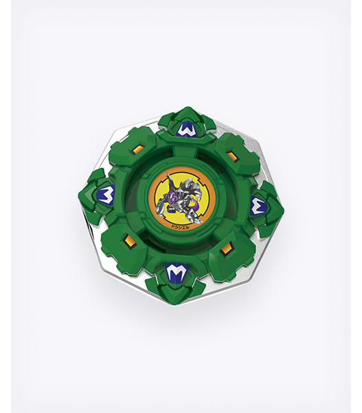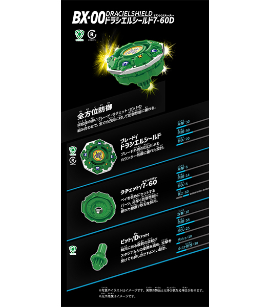 外周の凹凸によりカウンター防御に優れたブレードと、分厚く防御性能に優れた垂直7枚刃ラチェットの組み合わせにより、あらゆる方向に対しての防御性能に優れたベイブレード。