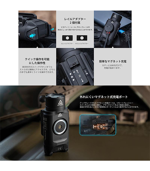 PL-3Rはマグネット充電式で、便利で環境に優しいタクティカルライトです。長いトラックでも使用できるように、リモコンスイッチは磁気部分を介して接続できます。また、バッテリー残量が10%未満になると、下部の電源インジケーターライトが赤く点灯します。
