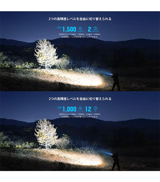PL-3R懐中電灯にはデュアル設定があり、High1:1500ルーメン、High2:1000ルーメンを自由に切り替えられます。また、ローモードとストロボモードを所有しており、様々な使用シーンに対応できます。本体は軽量・コンパクト(電池含まずわずか107g)で持ち運びに便利です。