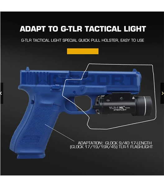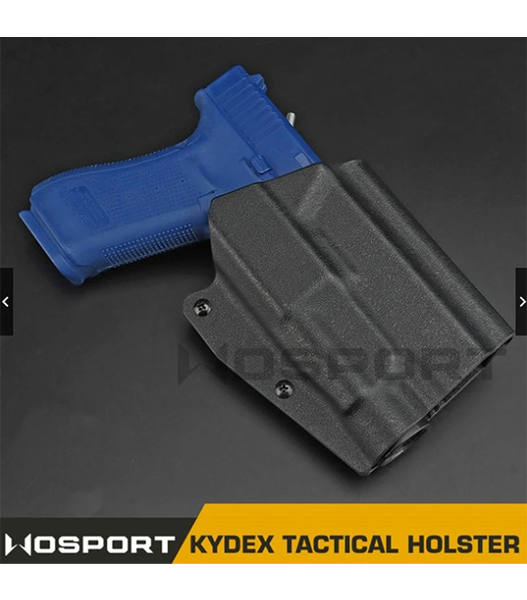 WoSporTTLR-1を装着したグロックシリーズ(G17/19/19X/45)用カイデックスホルスター。 素早いドローと収納が可能なデザインが特徴で、収納部は六角ネジによりテンション調整が可能な造りとなっています。 また、材質には高い耐候性・耐久性を誇る米国産カイデックスを使用しており実用性に優れます。