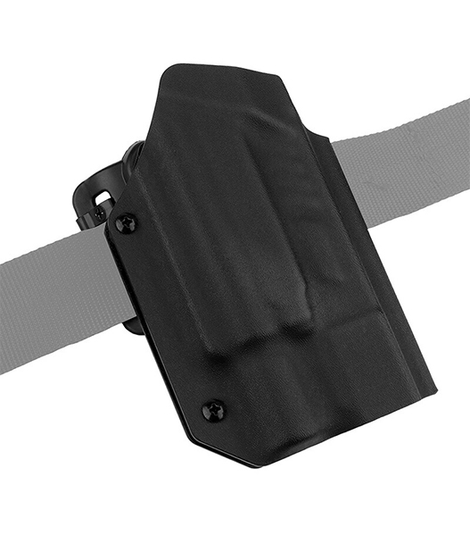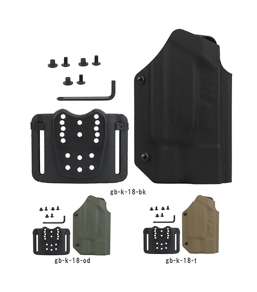 収納部は2箇所のテンション調整によってハンドガンを保持する作りとなっています。また、材質には高い耐候性・耐久性を誇る米国産カイデックスを使用しており実用性に優れます。 アタッチメントには、ベルトループ型のアタッチメントが付属しており、取り付けるベルトの幅によってアタッチメント側の幅を調整することで様々なベルトに対応可能です。