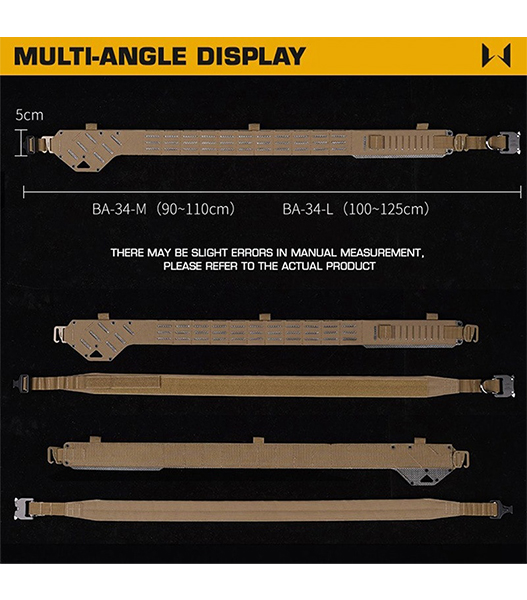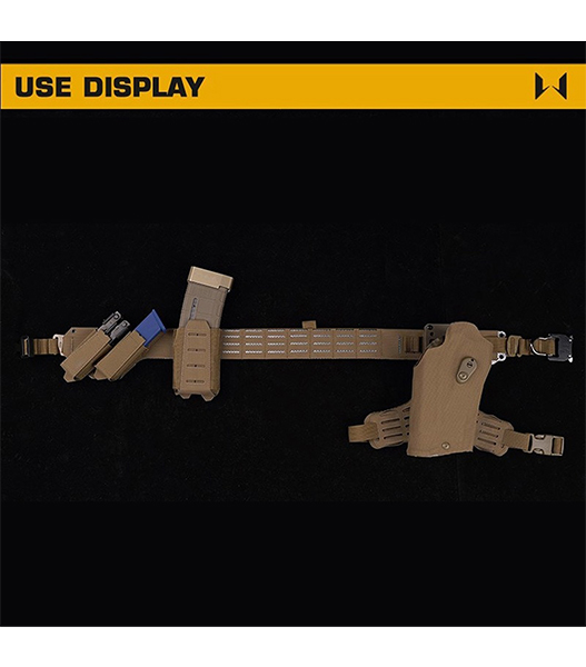 WoSporTアウターベルトにあり、ベルト左側のモール配置はピストルマグポーチなどを角度をつけて取り付けることができ、真上に引き抜くよりも素早くかつ容易にマガジンを引き抜くことができます。ベルト右側のサーモプラスティックを切断することで、約50〜60mmのベルトマウントに対応し、様々なホルスターやアダプターを取付可能です。