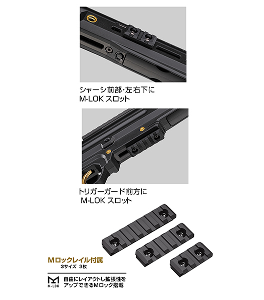 ・トリガーガード前方・シャーシ前部の左右下にM-LOKスロット装備
