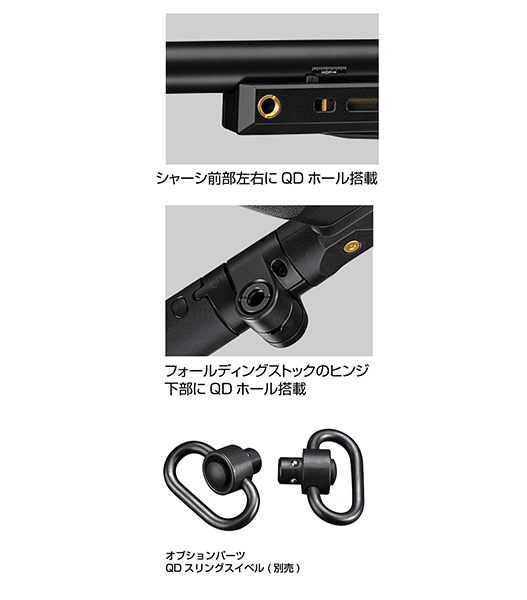 ・ストックヒンジ下部・シャーシ前部左右にQDホール装備