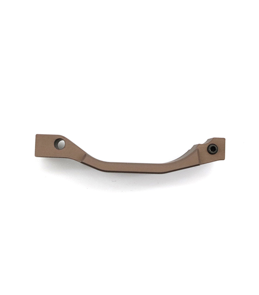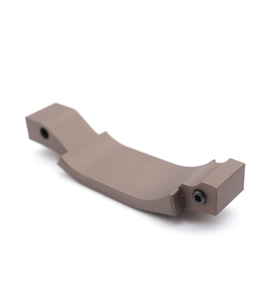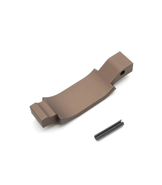 アルミ素材をCNC成形し、ガイズリーのロゴマーク刻印に表面はデザートダートカラー・アルマイト仕上げ。さりげないカスタムポイントながら、見た目だけでなくトリガーという重要な操作系に関わる大事なパーツです。