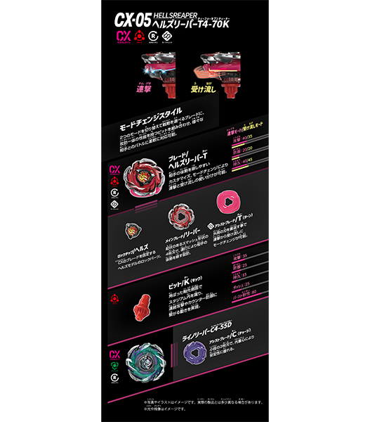 レアの「ヘルズリーパーT4-70K」は2つのモードを切り替えて戦略を選べるブレードに、攻防一体の性能を持つビットを組み合わせ、様々な相手とのバトルに対応したベイブレード。