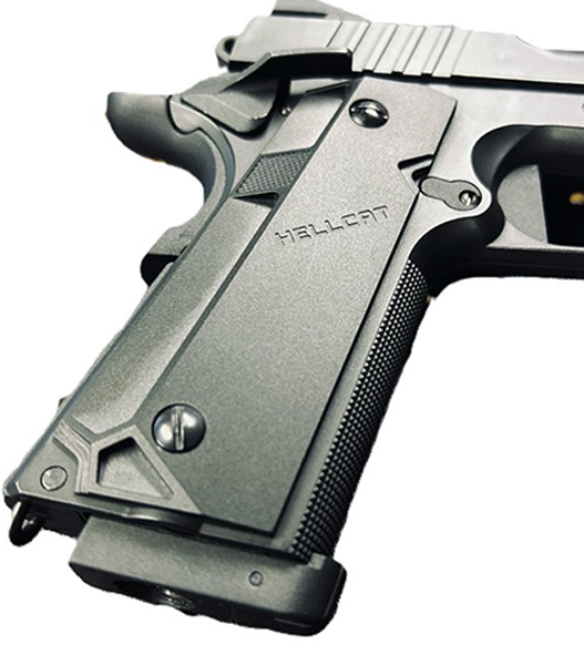 標準グリップを彫刻機で加工したもので、左面に月と猫のデザイン、右面にHELLCATの文字が彫刻されています。