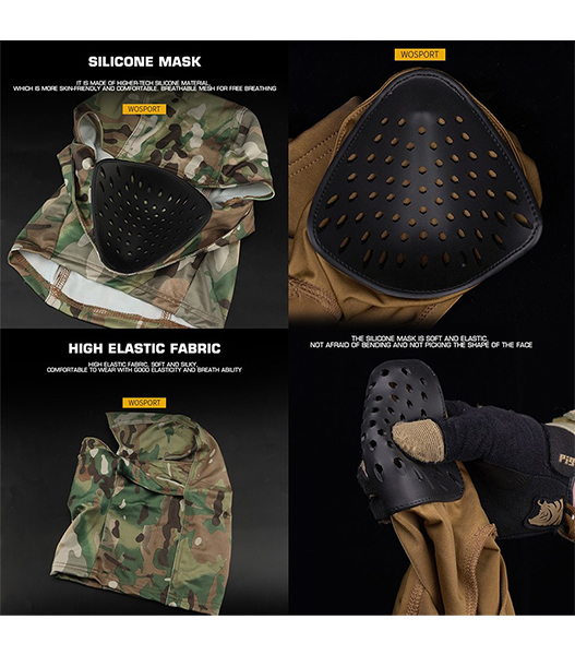 WoSporT製のWSTタクティカルバラクラバは口元にシリコン製のマスクが備え付けられており、サバゲーでの被弾から口元を守ることができます。シリコンマスクはバラクラバに縫い付けられているので、使用中にずれる心配もありません。