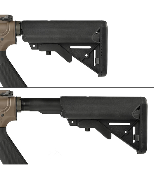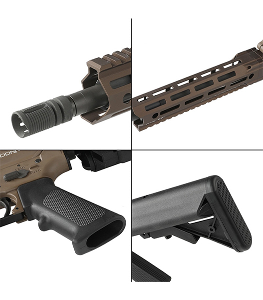 MFR(Modular Free-Float Rail)ハンドガードはM-LOKスロットを備え、スコープやグリップなどのアクセサリーを自在に装着可能。独自設計のストックとグリップは快適性と操作性を向上させており、競技射撃や自己防衛、パトロール任務など、幅広い用途に対応します。軽量設計により長時間の携行が容易で、初心者から上級者まで使用しやすいモデルです。