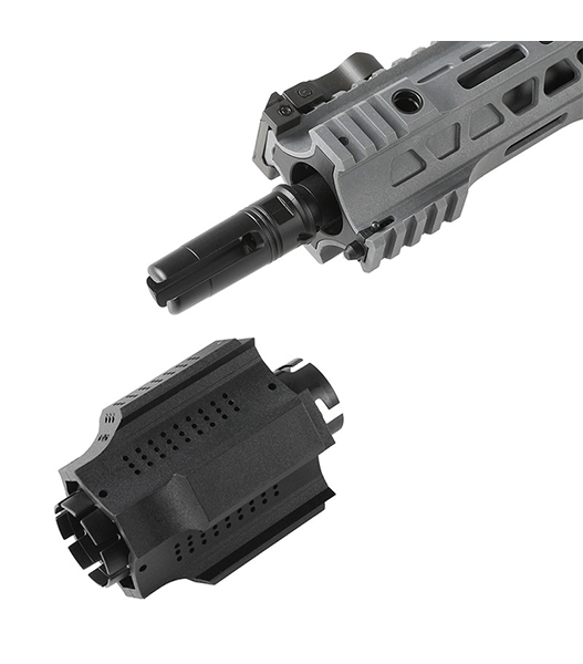 米国法規に適合させるため、ピン留めのコンペンセイターや独自設計のJailbreakマズルブレーキが装備されるモデルも存在します。レシーバーは7075-T6アルミをCNC加工した高剛性仕様で、フルフロートのM-LOK対応ハンドガードと一体化された先進的な外観が特徴です。