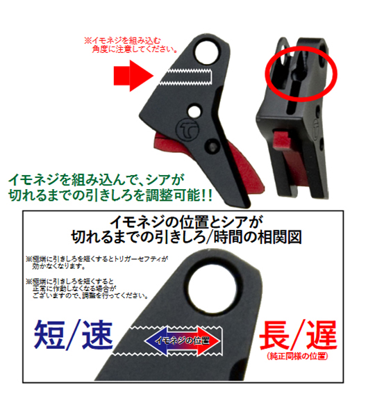 後部からイモネジの位置を調整する事で、トリガーの可動範囲を変更して引き始めと発射までの間隔を好みに調整出来ます。