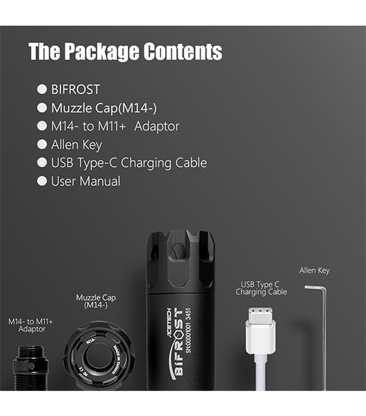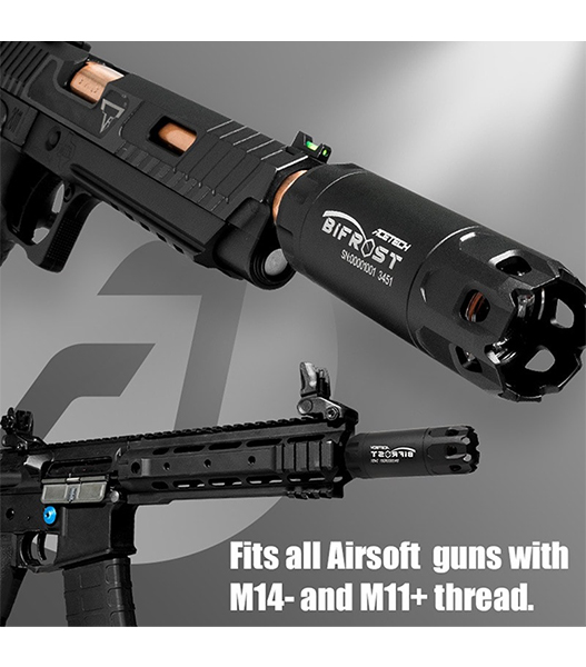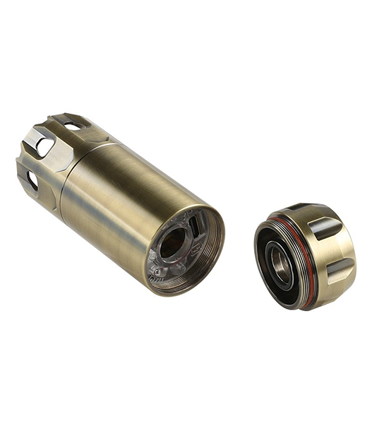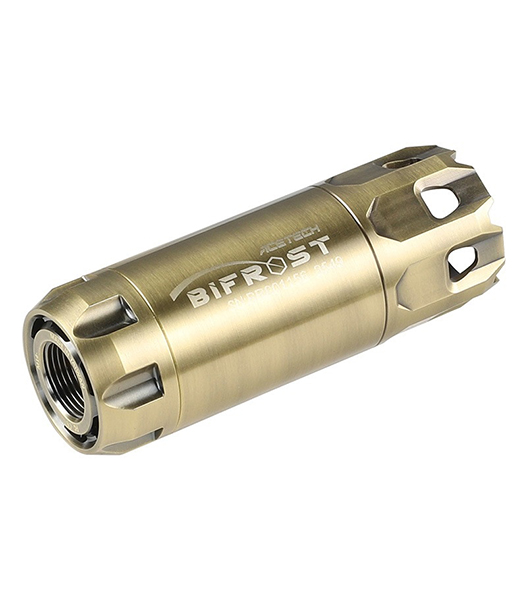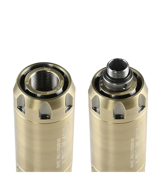本体は、外径30mm、全長81mm以下、重量僅か61gと超コンパクトサイズかつ軽量。標準で14mm逆ネジ仕様のため、アサルトライフルやサブマシンガンなどのライフル系に加え、付属の11mm正ネジアダプターを使用するとハンドガンにも装着可能となっています。