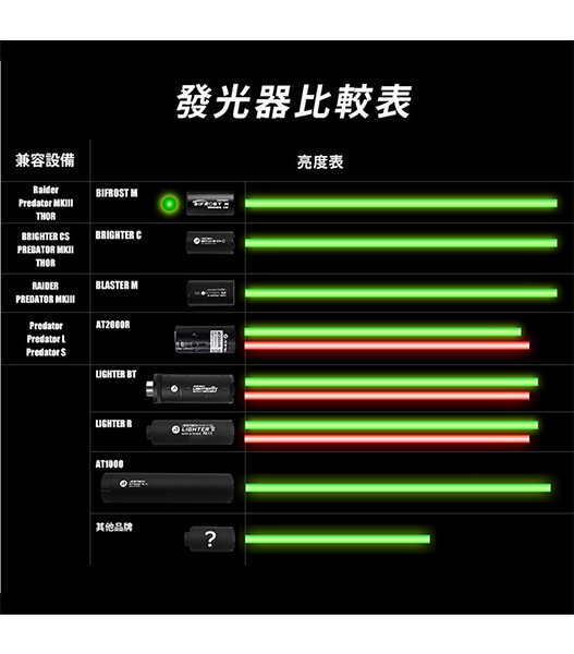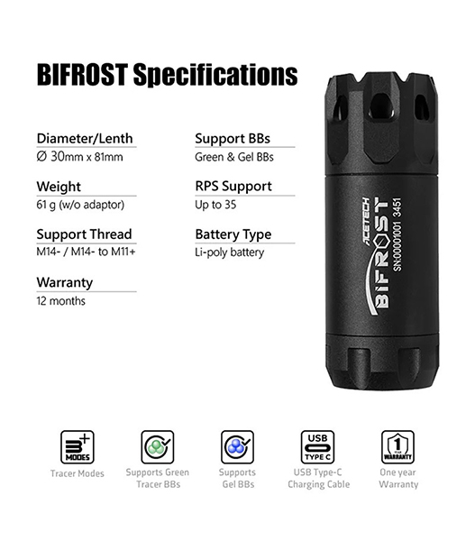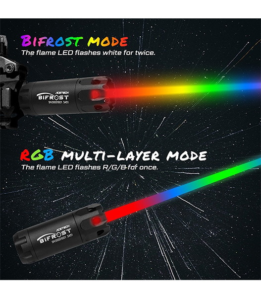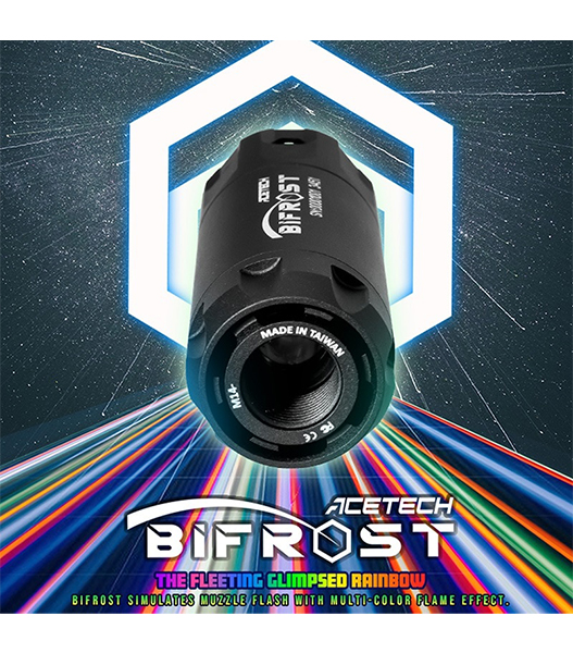 ACETECHグリーン発光BB弾によるトレーサー機能に加えて、RGBのLEDを使用することで通常の白色BB弾を七色に発光させることができる画期的なマズルフラッシュ/トレーサーユニット。発光モードはバイフロスト(レインボーカラー)、モノフレイムモード(7カラー単色)、RGBマルチレイヤ―モード(レッド/グリーン/ブルー)から選択可能です。フルオート射撃を行うと0.5秒ごとにカラーが変わる、ダイナミックレインボーモード機能も搭載されています。