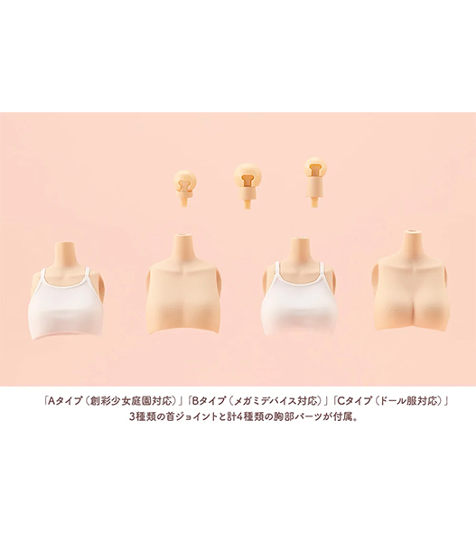 「Aタイプ(創彩少女庭園対応)」「Bタイプ(メガミデバイス対応)」「Cタイプ(ドール服対応)」の3種類が付属。