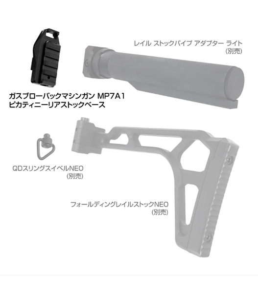 東京マルイガスブローバックマシンガンMP7A1のピカティニー規格レイルを配したストックベースです。当製品を取り付けることで、当社製『レイルストックベース』や『レイルストックパイプアダプターライト』が装着可能となり、お好みのM4ストックで運用出来ます。また、当社製『フォールディングレイルストックNEO』や『フォールディングレイルストックNEOバイザーストックタイプ』の取り付けもでき、操作性の向上やお好みのルックスへとカスタマイズできます。