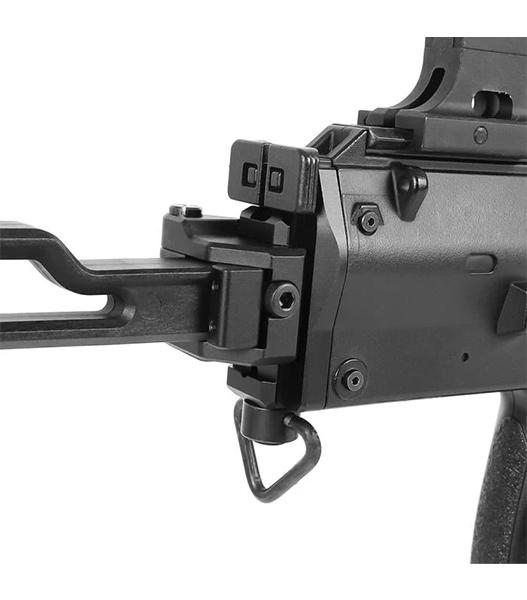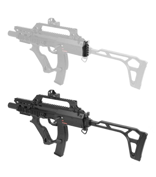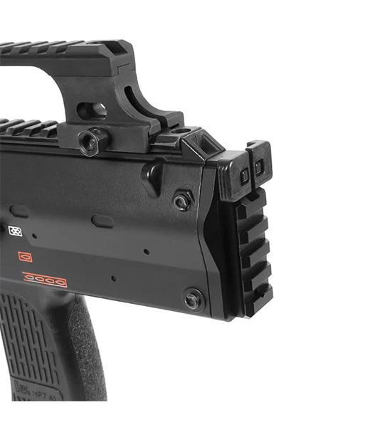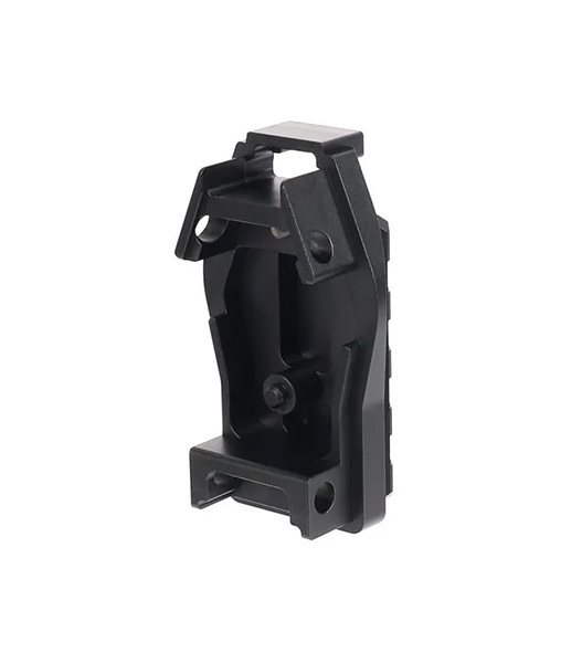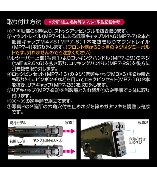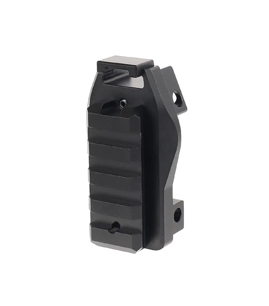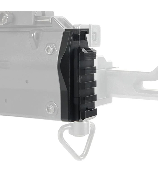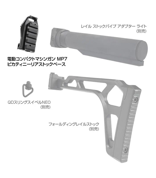 東京マルイ 電動コンパクトマシンガンシリーズ MP7用のピカティニーレイルを配したストックベースです。当製品を取付けることでストックを廃したコンパクトで取り回しの良いピストルスタイルとなり、当社製『レイルストックパイプアダプターライト』を取り付けることでM4系ストックの装着が可能です。また、当社製『フォールディングレイルストック』の取り付けもでき、操作性の向上やお好みのルックスへとカスタマイズできます。